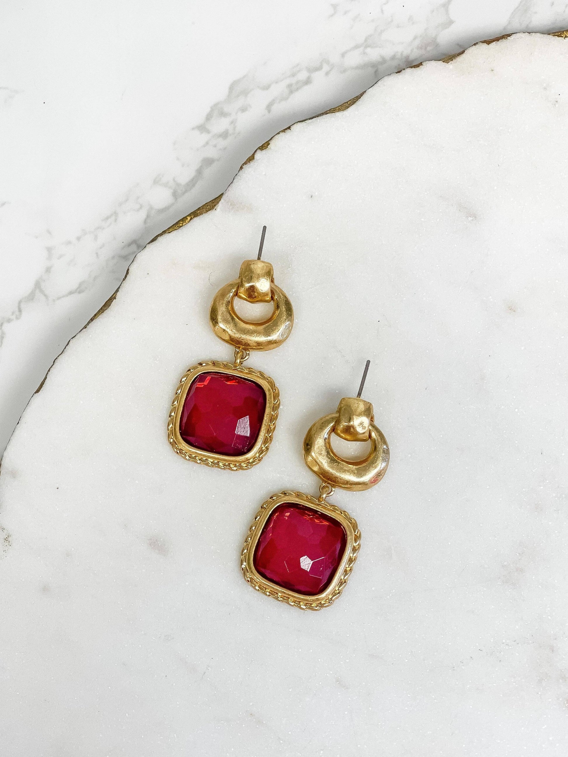 Prep Obsessed Wholesale - Golden Square Red Jewel Drop Earrings